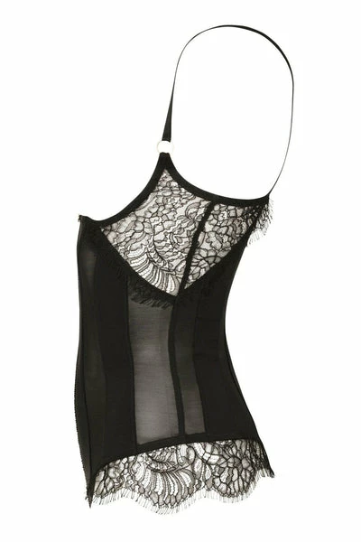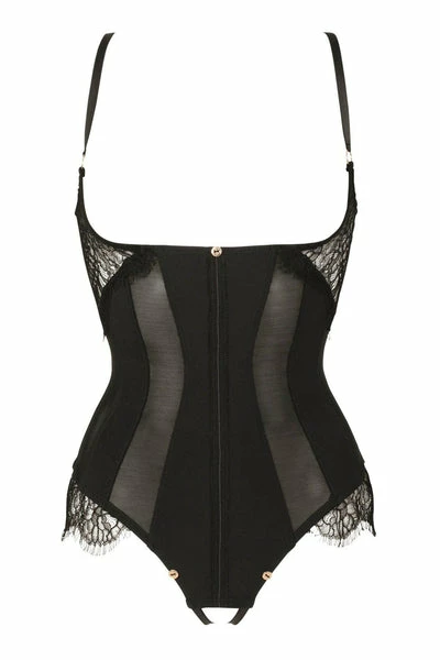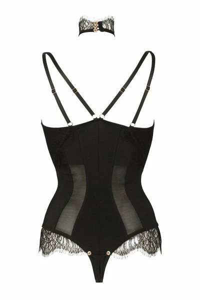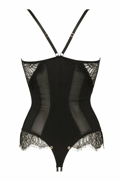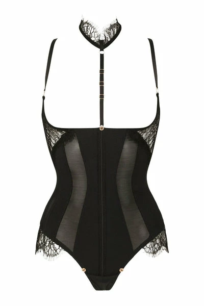 Bodysuit alternating lycra and mesh, two sheathing fabrics that will highlight your curves. Calais lace on the sides of the chest and on the hips. Removable thong with 4 rose gold buttons. Lace collar closed with 3 buttons also removable thanks to a button placed between the breasts.