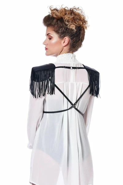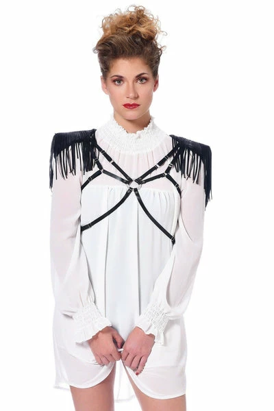 A very fetish complement. This harness in black wetlook with adjustable straps crossed at the back and at the chest. The fringes on the shoulder pads make this model a very original complement. Wear it with the Roxanne or Azia dress.